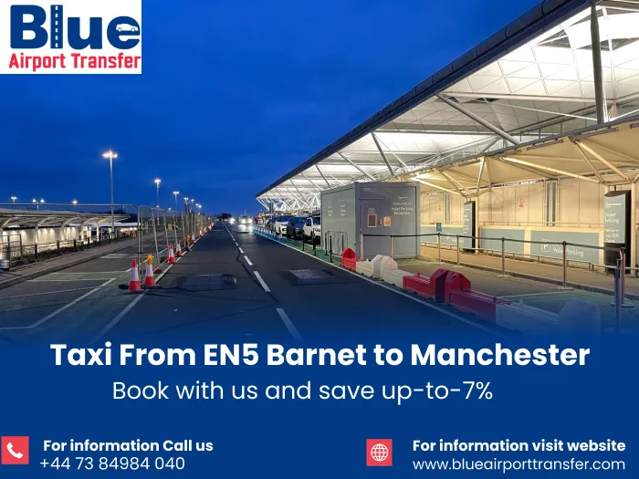Secure your ride in advance with Blue Airport Transfer and enjoy a seamless journey from EN5 Barnet to Manchester. Travel without the stress.
